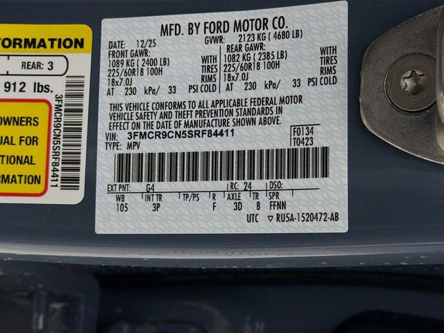 360-Degree Camera w/Trail & Split View, 4-Wheel Disc Brakes, 6 Speakers, ABS brakes, Air Conditioning, Alloy wheels, AM/FM radio: SiriusXM, AM/FM Stereo, Auto High-beam Headlights, Auto-dimming Rear-View mirror, Automatic temperature control, B&O Sound System by Bang & Olufsen, Brake assist, Compass, Connected Navigation, Delay-off headlights, Driver door bin, Driver vanity mirror, Dual front impact airbags, Dual front side impact airbags, Electronic Stability Control, Emergency communication system: SYNC 4 911 Assist, Equipment Group 300A, Four wheel independent suspension, Front anti-roll bar, Front Bucket Seats, Front Center Armrest, Front Driver/Passenger Seat Back Map Pockets, Front dual zone A/C, Front fog lights, Front Parking Sensors, Front reading lights, Fully automatic headlights, Garage door transmitter, HD Radio, Heated door mirrors, Heated front seats, Heated steering wheel, Illuminated entry, Knee airbag, Low tire pressure warning, Memory seat, Occupant sensing airbag, Outer Banks Tech Package+, Outside temperature display, Overhead airbag, Overhead console, Panic alarm, Passenger door bin, Passenger vanity mirror, Power door mirrors, Power driver seat, Power passenger seat, Power steering, Power windows, Premium Trimmed Front Bucket Seats w/Ebony/Roast, Radio data system, Rain sensing wipers, Rear anti-roll bar, Rear Parking Sensors, Rear reading lights, Rear seat center armrest, Rear window defroster, Rear window wiper, Remote keyless entry, Reverse Brake Assist, Security system, SiriusXM, Speed control, Speed-sensing steering, Speed-Sensitive Wipers, Split folding rear seat, Steering wheel mounted audio controls, SYNC 4 w/Enhanced Voice Recognition, Tachometer, Telescoping steering wheel, Tilt steering wheel, Traction control, Trip computer, Variably intermittent wipers, Wheels: 18 Ebony Black-Painted Aluminum.