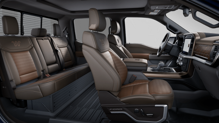 3.5L PowerBoost Full-Hybrid V6, 4WD, 14 Speakers, 4-Wheel Disc Brakes, 4x4 FX4 Off-Road Bodyside Decal, ABS brakes, Adjustable pedals, Air Conditioning, Alloy wheels, AM/FM radio: SiriusXM with 360L, Auto High-beam Headlights, Auto tilt-away steering wheel, Auto-dimming door mirrors, Auto-dimming Rear-View mirror, Automatic temperature control, Brake assist, Chrome wheels, Compass, Delay-off headlights, Driver door bin, Driver vanity mirror, Dual front impact airbags, Dual front side impact airbags, Electronic Stability Control, Emergency communication system: SYNC 4 911 Assist, Equipment Group 601A High, Front anti-roll bar, Front Bucket Seats, Front Center Armrest, Front dual zone A/C, Front fog lights, Front License Plate Bracket, Front reading lights, Front wheel independent suspension, Fully automatic headlights, FX4 Off-Road Package, Garage door transmitter, Genuine wood dashboard insert, Heads-Up Display, Heated door mirrors, Heated front seats, Heated rear seats, Heated steering wheel, Hill Descent Control, Illuminated entry, Internet access capable: FordPass Connect 5G, King Ranch Multicontour Leather Bucket Seats, Leather steering wheel, Low tire pressure warning, Memory seat, Monotube Rear Shocks, Navigation system: Connected Navigation, Occupant sensing airbag, Off-Road Tuned Front Shock Absorbers, Outside temperature display, Overhead airbag, Overhead console, Panic alarm, Passenger door bin, Passenger vanity mirror, Pedal memory, Power door mirrors, Power driver seat, Power moonroof, Power passenger seat, Power steering, Power windows, Radio data system, Radio: B&O Unleashed Sound System by Bang & Olufsen, Rain sensing wipers, Rear reading lights, Rear seat center armrest, Rear step bumper, Rear window defroster, Remote keyless entry, Rock Crawl Mode, Security system, Speed control, Split folding rear seat, Steering wheel memory, Steering wheel mounted audio controls, SYNC 4 w/Enhanced Voice Recognition, Tachometer, Telescoping steering wheel, Tilt steering wheel, Traction control, Trip computer, Turn signal indicator mirrors, Variably intermittent wipers, Ventilated front seats, Voltmeter, Wheel Well Liner, Wheels: 20 Chrome-Like PVD, 3.5L PowerBoost Full-Hybrid V6, 4WD.
