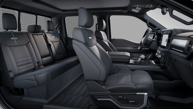 3.5L PowerBoost Full-Hybrid V6, 4WD, 4-Wheel Disc Brakes, 8 Speakers, ABS brakes, Adjustable pedals, Air Conditioning, Alloy wheels, AM/FM radio: SiriusXM with 360L, Auto High-beam Headlights, Auto tilt-away steering wheel, Auto-dimming door mirrors, Auto-dimming Rear-View mirror, Automatic temperature control, Brake assist, Bumpers: body-color, Compass, Delay-off headlights, Driver door bin, Driver vanity mirror, Dual front impact airbags, Dual front side impact airbags, Electronic Stability Control, Emergency communication system: SYNC 4 911 Assist, Equipment Group 702A High, Front anti-roll bar, Front Bucket Seats, Front Center Armrest, Front dual zone A/C, Front fog lights, Front reading lights, Front wheel independent suspension, Fully automatic headlights, Garage door transmitter, Heated door mirrors, Heated front seats, Heated rear seats, Heated steering wheel, Illuminated entry, Internet access capable: FordPass Connect 5G, Leather steering wheel, LED Sideview Mirror Spotlights, Low tire pressure warning, Memory seat, Navigation system: Connected Navigation, Occupant sensing airbag, Outside temperature display, Overhead airbag, Overhead console, Panic alarm, Passenger door bin, Passenger vanity mirror, Pedal memory, Power door mirrors, Power driver seat, Power passenger seat, Power steering, Power Telescoping/Glass/Folding Trailer Tow Mirrors, Power windows, Radio data system, Radio: B&O Sound System by Bang & Olufsen, Rain sensing wipers, Rear reading lights, Rear seat center armrest, Rear step bumper, Rear window defroster, Remote keyless entry, Retractable Rear Center Step, Security system, Speed control, Split folding rear seat, Steering wheel memory, Steering wheel mounted audio controls, SYNC 4 w/Enhanced Voice Recognition, Tachometer, Telescoping steering wheel, Tilt steering wheel, Tough Bed Spray-In Bedliner, Traction control, Tray Style Floor Liner, Trip computer, Turn signal indicator mirrors, Unique Multi-Contour Leather Bucket Seats, Variably intermittent wipers, Ventilated front seats, Voltmeter, Wheels: 20 Painted Gloss Ebony Black, 3.5L PowerBoost Full-Hybrid V6, 4WD.