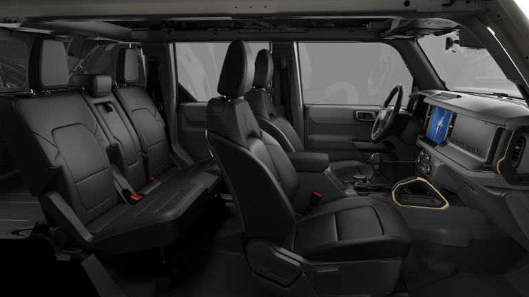 2-Door Intelligent Access with Lock/Unlock, 360-Degree Camera, 4-Wheel Disc Brakes, 7 Speakers, ABS brakes, Adaptive Cruise Control, Air Conditioning, Alloy wheels, AM/FM radio: SiriusXM with 360L, AM/FM Stereo, Ambient Footwell Lighting, Auto High-Beam Headlamps, Auto High-beam Headlights, Auto-dimming Rear-View mirror, BLIS Blind Spot Information System, Brake assist, Compass, Connected Navigation, Delay-off headlights, Driver and Front Passenger Illuminated Sliding Visor Vanity Mirrors, Driver door bin, Driver vanity mirror, Dual front impact airbags, Dual front side impact airbags, Dual Smart Charging USB Ports, Dual-Zone Electronic Automatic Temperature Control, Electronic Stability Control, Emergency communication system: 911 Assist, Equipment Group 334A Lux Package, Evasive Steering Assist, Exterior Parking Camera Rear, Ford Connectivity Package (1-Year Included), Front anti-roll bar, Front Bucket Seats, Front Center Armrest, Front fog lights, Front Parking Sensors, Front reading lights, Front Row Heated Seats, Front Stabilizer Disconnect, Front wheel independent suspension, Fully automatic headlights, Hard Top Sound Deadening Headliner, Heated door mirrors, Heated front seats, Heated Steering Wheel, High Clearance Suspension, Illuminated entry, Information on Demand Panel, Integrated roll-over protection, Lane-Keeping System, Leather Shift Knob, Low tire pressure warning, Marine Grade Vinyl Heated Bucket Seats, Occupant sensing airbag, Outside temperature display, Overhead airbag, Overhead console, Painted Hard Top, Panic alarm, Passenger door bin, Passenger vanity mirror, Position-Sensitive Bilstein Shock Absorbers, Power door mirrors, Power steering, Power windows, Pre-Collision Assist with Automatic Emergency Braking, Pro Power Onboard - 400W, Radio data system, Rear Parking Sensors, Rear-View Camera, Rear-Window Defroster and Washer, Remote keyless entry, Sasquatch Package, Security system, Sideview Mirrors, SiriusXM with 360L, Speed control, Split folding rear seat, Steering wheel mounted audio controls, SYNC 4, Tachometer, Telescoping steering wheel, Tilt steering wheel, Traction control, Trip computer, Variably intermittent wipers, Voltmeter, Wheels: 17 Carbonized Gray-Painted Aluminum, Wheels: 17 Matte Black Alloy.