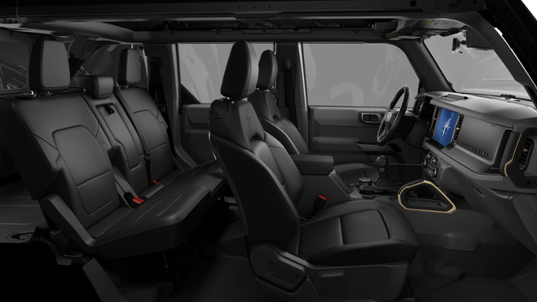 2-Door Intelligent Access with Lock/Unlock, 360-Degree Camera, 4-Wheel Disc Brakes, 4.7 Axle Ratio, 7 Speakers, ABS brakes, Adaptive Cruise Control, Air Conditioning, Alloy wheels, AM/FM radio: SiriusXM with 360L, AM/FM Stereo, Ambient Footwell Lighting, Auto High-Beam Headlamps, Auto High-beam Headlights, Auto-dimming Rear-View mirror, BLIS Blind Spot Information System, Brake assist, Compass, Connected Navigation, Delay-off headlights, Driver and Front Passenger Illuminated Sliding Visor Vanity Mirrors, Driver door bin, Driver vanity mirror, Dual front impact airbags, Dual front side impact airbags, Dual Smart Charging USB Ports, Dual-Zone Electronic Automatic Temperature Control, Electronic Stability Control, Emergency communication system: 911 Assist, Equipment Group 334A Lux Package, Evasive Steering Assist, Exterior Parking Camera Rear, Ford Connectivity Package (1-Year Included), Front anti-roll bar, Front Bucket Seats, Front Center Armrest, Front fog lights, Front Parking Sensors, Front reading lights, Front Row Heated Seats, Front wheel independent suspension, Fully automatic headlights, Hard Top Sound Deadening Headliner, Heated door mirrors, Heated front seats, Heated Steering Wheel, Illuminated entry, Information on Demand Panel, Integrated roll-over protection, Lane-Keeping System, Leather Shift Knob, Low tire pressure warning, Marine Grade Vinyl Heated Bucket Seats, Occupant sensing airbag, Outside temperature display, Overhead airbag, Overhead console, Panic alarm, Passenger door bin, Passenger vanity mirror, Power door mirrors, Power steering, Power windows, Pre-Collision Assist with Automatic Emergency Braking, Pro Power Onboard - 400W, Radio data system, Rear Parking Sensors, Rear-View Camera, Rear-Window Defroster and Washer, Remote keyless entry, Security system, Shadow Black Painted Hard Top, Sideview Mirrors, SiriusXM with 360L, Speed control, Split folding rear seat, Steering wheel mounted audio controls, SYNC 4, Tachometer, Telescoping steering wheel, Tilt steering wheel, Traction control, Trip computer, Variably intermittent wipers, Voltmeter, Wheels: 17 Carbonized Gray-Painted Aluminum.
