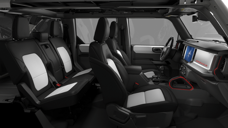 18 Bright Machined Aluminum Wheels, 360-Degree Camera, 4-Wheel Disc Brakes, 60th Anniversary Package, 7 Speakers, ABS brakes, Adaptive Cruise Control, Air Conditioning, Alloy wheels, AM/FM radio: SiriusXM with 360L, AM/FM Stereo, Auto High-beam Headlights, Auto-dimming Rear-View mirror, Automatic temperature control, Black Molded-in-Color Door Handles, Brake assist, Compass, Connected Navigation, Console Lock Box Safe Deposit, Delay-off headlights, Driver door bin, Driver vanity mirror, Dual front impact airbags, Dual front side impact airbags, Electronic Stability Control, Emergency communication system: 911 Assist, Equipment Group 314A Lux Package, Evasive Steering Assist, Exterior Parking Camera Rear, Ford Connectivity Package (1-Year Included), Front anti-roll bar, Front Bucket Seats, Front Center Armrest, Front dual zone A/C, Front fog lights, Front Parking Sensors, Front reading lights, Front wheel independent suspension, Fully automatic headlights, Hard Top Sound Deadening Headliner, Heated door mirrors, Heated front seats, Heated Leather-Trimmed/Vinyl Bucket Seats, Heated steering wheel, High Clearance Fender Flares, High Clearance Suspension, Illuminated entry, Information on Demand Panel, Integrated roll-over protection, Leather Shift Knob, Leather-Trimmed/Vinyl Bucket Seats, Low tire pressure warning, Navigation system: Connected Navigation, Occupant sensing airbag, Outside temperature display, Overhead airbag, Overhead console, Painted Door Handles, Panic alarm, Passenger door bin, Passenger vanity mirror, Position-Sensitive Bilstein Shock Absorbers, Power door mirrors, Power driver seat, Power passenger seat, Power steering, Power windows, Radio data system, Rear seat center armrest, Remote keyless entry, Sasquatch Package, Security system, Sideview Mirrors, SiriusXM with 360L, Speed control, Split folding rear seat, Steel Front Bumper, Steering wheel mounted audio controls, SYNC 4, Tachometer, Telescoping steering wheel, Tilt steering wheel, Traction control, Trip computer, Variably intermittent wipers, Voltmeter, Warm Alloy Grille, Wheels: 17 Gravity Gray-Painted Alloy, Wheels: 17 Matte Black Alloy, Wimbledon White-Painted Hard Top.