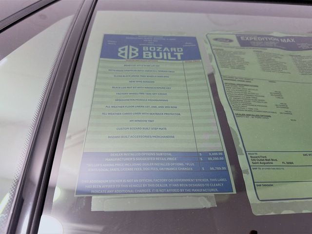 10 Speakers, 2nd Row Power-Folding Captain's Chairs, 3.73 Axle Ratio, 3rd row seats: split-bench, 4-Wheel Disc Brakes, ABS brakes, Air Conditioning, Alloy wheels, AM/FM radio: SiriusXM with 360L, Apple CarPlay/Android Auto, Auto High-beam Headlights, Auto-dimming door mirrors, Auto-dimming Rear-View mirror, Automatic temperature control, Black Belt Molding, Black Expedition Lettering on Hood, Black Headlamp Bezel with Ebony Trim Applique, Black Onyx Painted Power Deployable Running Boards, Black Platinum Badge on Tailgate, Black Roof Rails, BlueCruise (equipment + 1-Year + 90-Day Plan), BlueCruise Equipped (90-Day Trial), Brake assist, Bumpers: body-color, Carbon Black Front Bumper/Fascia, Compass, Delay-off headlights, Driver door bin, Driver vanity mirror, Driver's Package, Dual front impact airbags, Dual front side impact airbags, Electronic Stability Control, Emergency communication system: 911 Assist, Engine Sound Enhancer, Equipment Group 600A Standard Package, Exterior Parking Camera Rear, Ford Connectivity Package (1-Time Purchase), Ford Connectivity Package (1-Year Included), Ford Digital Experience, Four wheel independent suspension, Front anti-roll bar, Front Bucket Seats, Front Center Armrest, Front dual zone A/C, Front reading lights, Fully automatic headlights, Garage door transmitter, Genuine wood dashboard insert, Genuine wood door panel insert, Heated and Ventilated Leather Front Captain's Chairs, Heated door mirrors, Heated front seats, Heated rear seats, Heated steering wheel, High Flow Exhaust System, Illuminated entry, Intersection Assist, Leather steering wheel, Low tire pressure warning, Memory seat, Navigation System, Occupant sensing airbag, Outside temperature display, Overhead airbag, Overhead console, Panic alarm, Passenger door bin, Passenger vanity mirror, Power door mirrors, Power driver seat, Power moonroof: Vista Roof, Power passenger seat, Power steering, Power Tilt/Telescopic Steering Wheel with Memory, Power windows, Radio data system, Radio: B&O Play Unleashed, Radio: B&O Sound System by Bang and Olufsen, Rain sensing wipers, Rear air conditioning, Rear anti-roll bar, Rear reading lights, Rear Side Windows Laminated Glass, Rear window defroster, Rear window wiper, Reclining 3rd row seat, Remote keyless entry, Security system, Signature Grille Lighting, SiriusXM with 360L, Speed control, Speed-sensing steering, Speed-Sensitive Wipers, Split folding rear seat, Spoiler, Stealth Appearance Package, Stealth Performance Package, Steering wheel memory, Steering wheel mounted audio controls, Tachometer, Telescoping steering wheel, Tilt steering wheel, Traction control, Trip computer, Turn signal indicator mirrors, Variably intermittent wipers, Ventilated front seats, Voltmeter, Wheels: 20 x 8.5 Ebony Bright Machined Aluminum, Wheels: 22 x 9.0 Ebony Bright Machined Face Aluminum, Wheels: 24 x 9.5 Ebony Painted Aluminum.