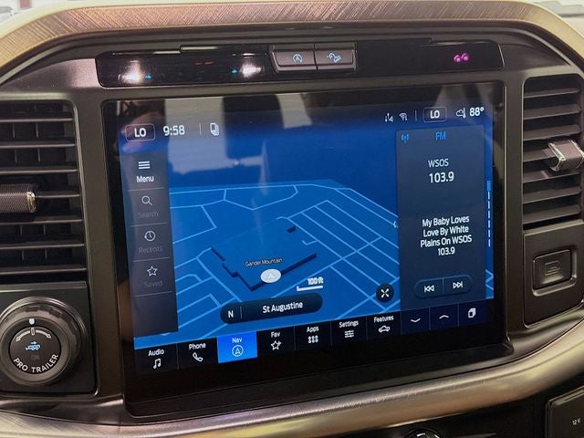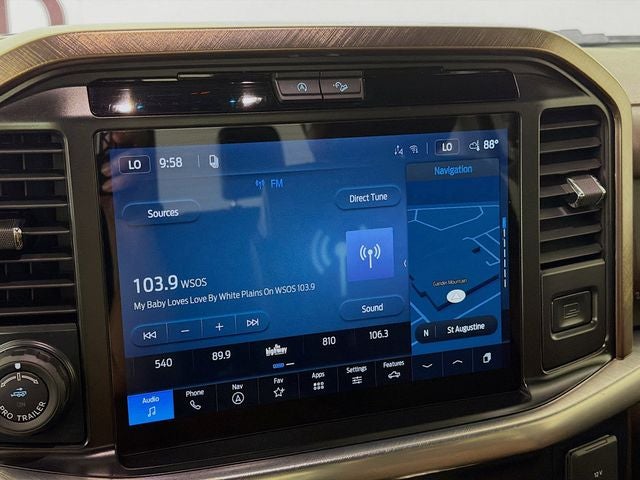 4WD, 4-Wheel Disc Brakes, 4x4 FX4 Off-Road Bodyside Decal, 8 Speakers, ABS brakes, Adjustable pedals, Air Conditioning, Alloy wheels, AM/FM radio: SiriusXM with 360L, Auto High-beam Headlights, Auto tilt-away steering wheel, Auto-dimming door mirrors, Auto-dimming Rear-View mirror, Automatic temperature control, Brake assist, Chrome wheels, Compass, Delay-off headlights, Driver door bin, Driver vanity mirror, Driver's Side SecuriCode Keyless-Entry Keypad, Dual front impact airbags, Dual front side impact airbags, Electronic Locking with 3.55 Axle Ratio, Electronic Stability Control, Emergency communication system: SYNC 4 911 Assist, Equipment Group 601A High, Ford Connectivity Package (1-Year Included), Front anti-roll bar, Front Bucket Seats, Front Center Armrest, Front dual zone A/C, Front fog lights, Front reading lights, Front wheel independent suspension, Fully automatic headlights, FX4 Off-Road Package, Garage door transmitter, Genuine wood dashboard insert, GVWR: 7,400 lbs Payload Package, Heated door mirrors, Heated front seats, Heated rear seats, Heated steering wheel, Hill Descent Control, Illuminated entry, Internet access capable: 5G Modem - Ford Connectivity Package, Leather steering wheel, Low tire pressure warning, Memory seat, Navigation system: Connected Navigation, Occupant sensing airbag, Off-Road Tuned Front Shock Absorbers, Outside temperature display, Overhead airbag, Overhead console, Panic alarm, Passenger door bin, Passenger vanity mirror, Pedal memory, Power door mirrors, Power driver seat, Power passenger seat, Power steering, Power windows, Pro Access Tailgate, Pro Power Onboard - 2KW, Radio data system, Radio: B&O Sound System by Bang and Olufsen, Rain sensing wipers, Rear reading lights, Rear seat center armrest, Rear step bumper, Rear window defroster, Remote keyless entry, Security system, Speed control, Split folding rear seat, Steering wheel memory, Steering wheel mounted audio controls, SYNC 4 with Enhanced Voice Recognition, Tachometer, Telescoping steering wheel, Tilt steering wheel, Traction control, Trip computer, Turn signal indicator mirrors, Twin Panel Moonroof, Variably intermittent wipers, Ventilated front seats, Wheels: 20 Chrome-Like PVD, 4WD.