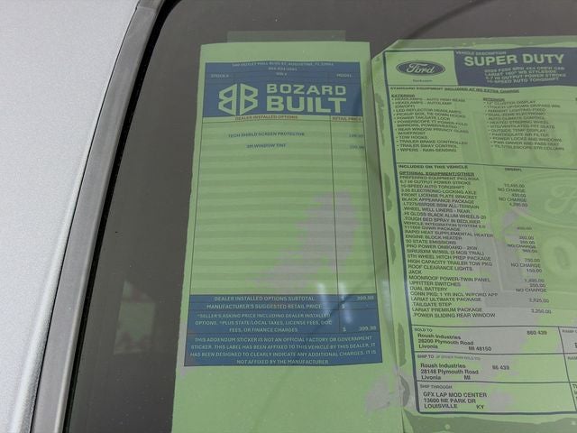 4WD, 4-Way Adjustable Headrests, 4-Wheel Disc Brakes, 410 Amp Dual Alternators, 5th Wheel/Gooseneck Hitch Prep Package, 6 Ebony Black Angular Running Boards, 8 Speakers, ABS brakes, Adaptive Cruise Control with Stop-and-Go, Adjustable pedals, Air Conditioning, Alloy wheels, AM/FM radio: SiriusXM with 360L, Auto High-beam Headlights, Auto-dimming Rear-View mirror, Automatic High Beam, Automatic temperature control, Black Appearance Package, Black Painted Front Grille Surround, BLIS with Cross-Traffic Alert, Body Color Front and Rear Bumpers, Brake assist, Bumpers: chrome, Compass, Delay-off headlights, Driver door bin, Driver vanity mirror, Dual AGM 68 AH Battery, Dual front impact airbags, Dual front side impact airbags, Ebony Black Painted Mirror Caps, Electronic Stability Control, Emergency communication system: SYNC 4 911 Assist, Engine Block Heater, Flow-Through Console, Ford Connectivity Package (1-Year Included), Front ActiveX Trimmed 40/Console/40 Seats, Front and Rear Parking Sensors, Front anti-roll bar, Front Bucket Seats, Front Center Armrest, Front dual zone A/C, Front fog lights, Front License Plate Bracket, Front reading lights, Fully automatic headlights, Garage door transmitter, GVWR: F-250 >10K Package, Head-Up Display, Heated door mirrors, Heated front seats, Heated rear seats, Heated steering wheel, High Capacity 11.6 Axle Upgrade Package, Illuminated entry, Internet access capable: 5G Modem - Ford Connectivity Package, Lane-Keeping System, Lariat Premium Package, Lariat Ultimate Package, LED Roof Clearance Lights, Low tire pressure warning, Memory seat, Navigation system: Connected Navigation, Order Code 608A, Outside temperature display, Overhead airbag, Overhead console, Panic alarm, Passenger door bin, Passenger vanity mirror, Pedal memory, Post-Collision Braking, Power door mirrors, Power driver seat, Power passenger seat, Power steering, Power windows, Power-Deployable Running Boards, Power-Sliding Rear-Window with Defrost, Pre-Collision Assist, Privacy Glass, Pro Power Onboard - 2kW, Pro Trailer Backup Assist, Pro Trailer Hitch Assist, Radio: B&O Sound System by Bang and Olufsen, Radio: B&O Unleashed Sound System by Bang & Olufsen, Rain sensing wipers, Rapid-Heat Supplemental Cab Heater, Rear Parking Sensors, Rear reading lights, Rear seat center armrest, Rear step bumper, Rear window defroster, Remote keyless entry, Security system, SiriusXM with 360L, Speed control, Split folding rear seat, Steering wheel mounted audio controls, SYNC 4 with Enhanced Voice Recognition, Tachometer, Tailgate Step and Handle, Telescoping steering wheel, Tilt steering wheel, Traction control, Trip computer, Turn signal indicator mirrors, Twin Panel Power Moonroof, Upfitter Switches (6), Variably intermittent wipers, Vehicle Integration System 2.0, Ventilated front seats, Wheels: 18 Bright Machined and Carbonized Gray Aluminum, 4WD.