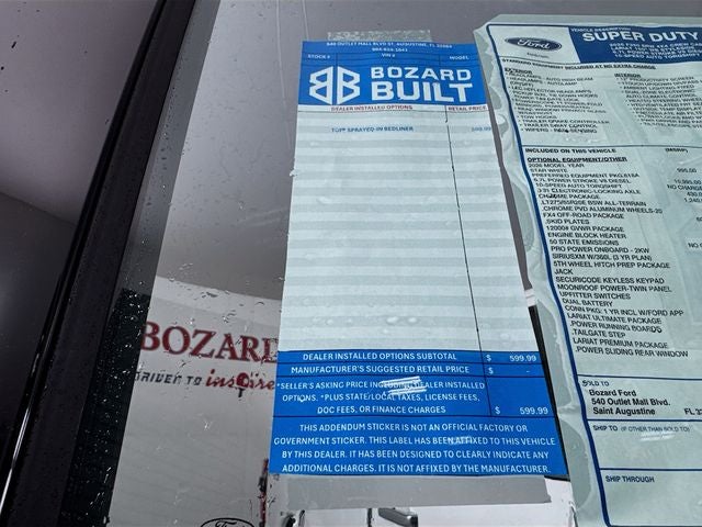 4WD, 4-Wheel Disc Brakes, 410 Amp Dual Alternators, ABS brakes, Adjustable pedals, Air Conditioning, Alloy wheels, AM/FM radio: SiriusXM with 360L, Auto High-beam Headlights, Auto-dimming Rear-View mirror, Automatic temperature control, Brake assist, Compass, Delay-off headlights, Driver door bin, Driver vanity mirror, Dual front impact airbags, Dual front side impact airbags, Electronic Stability Control, Emergency communication system: SYNC 4 911 Assist, Flow-Through Console, Ford Connectivity Package (1-Year Included), Front anti-roll bar, Front Bucket Seats, Front Center Armrest, Front dual zone A/C, Front fog lights, Front reading lights, Fully automatic headlights, FX4 Off-Road Package, Garage door transmitter, GVWR: F-250 >10K Package, Heated door mirrors, Heated front seats, Heated rear seats, Heated steering wheel, High Capacity 11.6 Axle Upgrade Package, Hill Descent Control, Illuminated entry, Internet access capable: 5G Modem - Ford Connectivity Package, Low tire pressure warning, Memory seat, Navigation system: Connected Navigation, Off-Road Specifically Tuned Shock Absorbers, Outside temperature display, Overhead airbag, Overhead console, Panic alarm, Passenger door bin, Passenger vanity mirror, Pedal memory, Power door mirrors, Power driver seat, Power passenger seat, Power steering, Power windows, Radio: B&O Unleashed Sound System by Bang & Olufsen, Rain sensing wipers, Rear reading lights, Rear seat center armrest, Rear step bumper, Rear window defroster, Remote keyless entry, Security system, SiriusXM with 360L, Speed control, Split folding rear seat, Steering wheel mounted audio controls, SYNC 4 with Enhanced Voice Recognition, Tachometer, Telescoping steering wheel, Tilt steering wheel, Traction control, Trip computer, Turn signal indicator mirrors, Unique FX4 Off-Road Box Decal, Variably intermittent wipers, Ventilated front seats, 4WD.