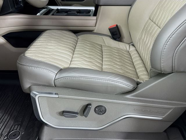 4WD, 14 Speakers, 17 Forged Polished Aluminum Wheels, 4-Wheel Disc Brakes, 5th Wheel/Gooseneck Hitch Prep Package, ABS brakes, Adjustable pedals, Air Conditioning, Alloy wheels, AM/FM radio: SiriusXM with 360L, Auto High-beam Headlights, Auto tilt-away steering wheel, Auto-dimming Rear-View mirror, Automatic temperature control, Brake assist, Bumpers: body-color, Compass, Delay-off headlights, Driver door bin, Driver vanity mirror, Dual front impact airbags, Dual front side impact airbags, Dual rear wheels, Electronic Stability Control, Emergency communication system: SYNC 4 911 Assist, Engine Block Heater, Flow-Through Console, Ford Connectivity Package (1-Year Included), Front anti-roll bar, Front Bucket Seats, Front Center Armrest, Front dual zone A/C, Front fog lights, Front reading lights, Front Wheel Well Liners, Fully automatic headlights, FX4 Off-Road Package, Garage door transmitter, GVWR: 14,000 Lb Payload Package, Heads-Up Display, Heated door mirrors, Heated front seats, Heated rear seats, Heated steering wheel, Hill Descent Control, Illuminated entry, Illuminated Scuff Plates, Internet access capable: 5G Modem - Ford Connectivity Package, Leather steering wheel, Low tire pressure warning, Memory seat, Navigation system: Connected Navigation, Off-Road Specifically Tuned Shock Absorbers, Order Code 723A, Outside temperature display, Overhead airbag, Overhead console, Panic alarm, Passenger door bin, Passenger vanity mirror, Pedal memory, Platinum Plus Package, Power door mirrors, Power driver seat, Power passenger seat, Power steering, Power windows, Premium Leather Instrument Panel Topper, Premium Luxury Leather-Wrapped Steering Wheel, Premium Venetian Leather Door Panel, Radio: B&O Unleashed Sound System by Bang & Olufsen, Rain sensing wipers, Rear anti-roll bar, Rear reading lights, Rear seat center armrest, Rear step bumper, Rear window defroster, Remote keyless entry, Satin Chrome Door Handles, SecuriCode Keyless Entry Keypad (driver's Side), Security system, SiriusXM with 360L, SiriusXM with 360L (3-Year Plan), Speed control, Split folding rear seat, Steering wheel memory, Steering wheel mounted A/C controls, Steering wheel mounted audio controls, SYNC 4 with Enhanced Voice Recognition, Tachometer, Telescoping steering wheel, Tilt steering wheel, Tough Bed Spray-in Bedliner, Traction control, Trip computer, Turn signal indicator mirrors, Unique FX4 Off-Road Box Decal, Unique Platinum Leather 40/Console/40 Seats, Unique Platinum Plus Luxury Leather 40/Console/40 Seats, Unique Satin Finish Grille, Unique Split Center Console Armrest, Variably intermittent wipers, Ventilated front seats, 4WD.