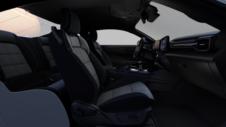 1st Row Carpeted Black Floor Mats, 4-Wheel Disc Brakes, 6 Speakers, ABS brakes, Accent Stitched Center Console Lid, Air Conditioning, Alloy wheels, AM/FM radio, AM/FM Stereo, Auto High-beam Headlights, Automatic temperature control, Black Painted Strut-Tower Brace, Brake assist, Brembo Brake System with Performance Linings, Bumpers: body-color, Cloth Bucket Seats, Compass, Delay-off headlights, Driver door bin, Driver vanity mirror, Dual front impact airbags, Dual front side impact airbags, Electric Hand-Operated Parking Brake (drift Brake), Electronic Stability Control, Emergency communication system: 911 Assist, Exterior Parking Camera Rear, Four wheel independent suspension, Front anti-roll bar, Front Bucket Seats, Front Center Armrest, Front dual zone A/C, Front reading lights, Front Towing Hooks, Fully automatic headlights, GT Performance Package, Heavy-Duty Front Springs, Illuminated entry, Knee airbag, Leather Shift Knob, Leather steering wheel, Low tire pressure warning, Occupant sensing airbag, Outside temperature display, Overhead airbag, Overhead console, Painted High Gloss Black/Carbon Black Grille, Panic alarm, Passenger door bin, Passenger vanity mirror, Power door mirrors, Power steering, Power windows, Radio data system, Rain sensing wipers, Rear anti-roll bar, Rear Parking Sensors, Rear window defroster, Remote keyless entry, Speed control, Speed-sensing steering, Speed-Sensitive Wipers, Split folding rear seat, Sport steering wheel, Steering wheel mounted audio controls, SYNC 4, Tachometer, Telescoping steering wheel, Tilt steering wheel, Traction control, Trip computer, Unique Chassis Tuning, Unique Stability Control, Upsized Rear Sway Bar, Variably intermittent wipers, Voltmeter, Wheels: 8 x 8.5 Ebony Black Painted Aluminum.